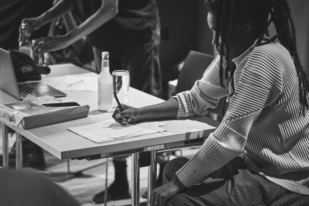 Wie sieht so eine Zusammenarbeit konkret aus? Der Rapper billy woods beschreibt auf Nachfrage die Zusammenarbeit an BRASS (2020) als fruchtbar, gerade weil Moor Mother jede Erwartung auflöst: »I am always aware that Camae can, or could, do anything. She is an artist whose range and creative instincts can take them anywhere«. (Ich bin mir immer bewusst, dass Camae alles tun kann oder könnte. Sie ist eine Künstlerin, deren Bandbreite und kreative Instinkte sie überallhin führen können.) Diese Offenheit verlangt permanente Kommunikation. Der Austausch selbst wird zur Kompositionsmethode. billy woods kann nichts vorausdenken, muss antworten auf das, was kommt: »A verse, a poem, a beat, or something else I didn’t even think of«. (Eine Strophe, ein Gedicht, ein Beat – oder etwas, woran ich noch nicht einmal gedacht habe.)